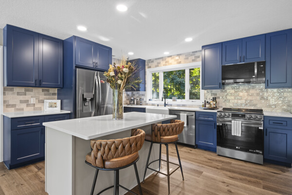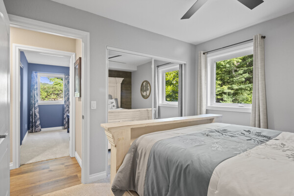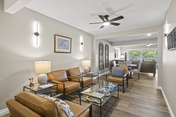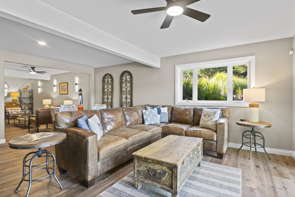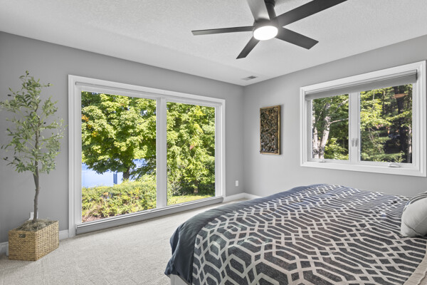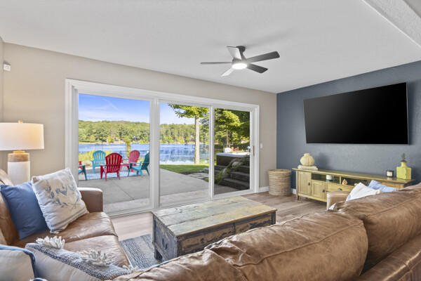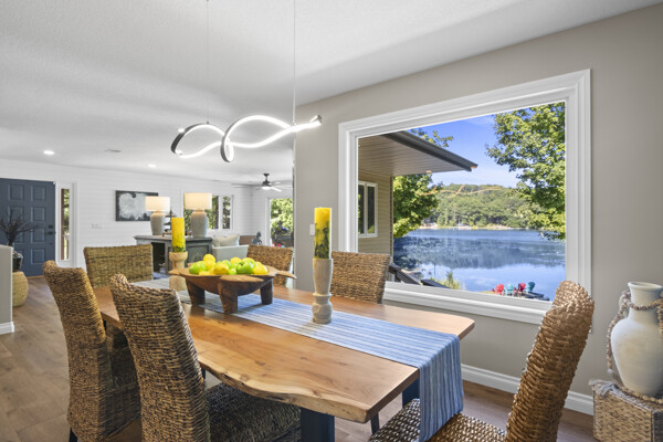 Inside, the home has been entirely reimagined since 2024 with sophisticated finishes that elevate it far beyond the typical inland lake homes in the area. Spanning over 3,200 square feet, the thoughtful two-level floor plan offers 6 bedrooms and 3 bathrooms, balancing generous gathering spaces with private retreats. Every room captures tranquil lake vistas and nature scenes, enhanced by soft, inviting color palettes and new stone, carpet, and plank flooring throughout.