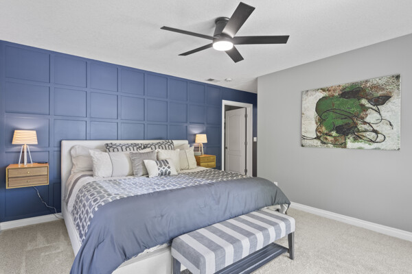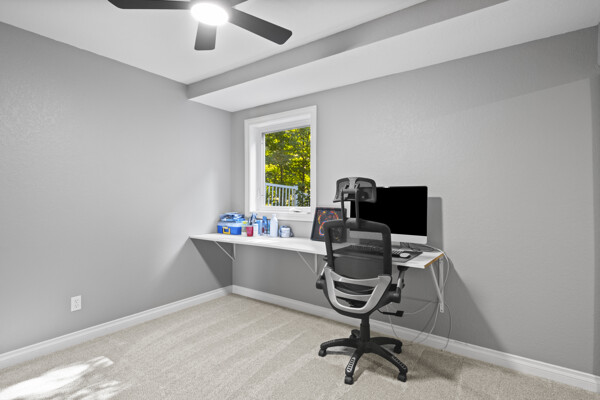 The main-level great room showcases panoramic lake views and flows into a chef’s kitchen featuring custom navy shaker cabinetry, neutral solid-surface countertops, a prep island with brand-new stainless appliances, and a spacious walk-in pantry. The graceful owner’s suite enjoys stunning east-facing sunrise views, a spa-inspired ensuite with oversized shower, dual vanities, and a generous walk-in closet. Additional main-level highlights include a guest bedroom currently used as the owner’s office, a full bathroom, laundry room, and direct garage access.